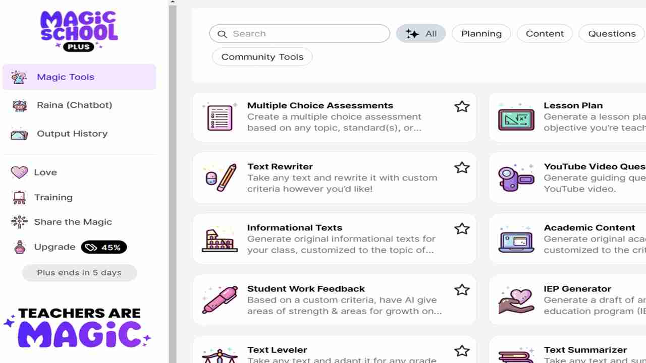 Magic School AI is packed with a variety of tools and features that cater to different aspects of teaching. Some of the key types include: